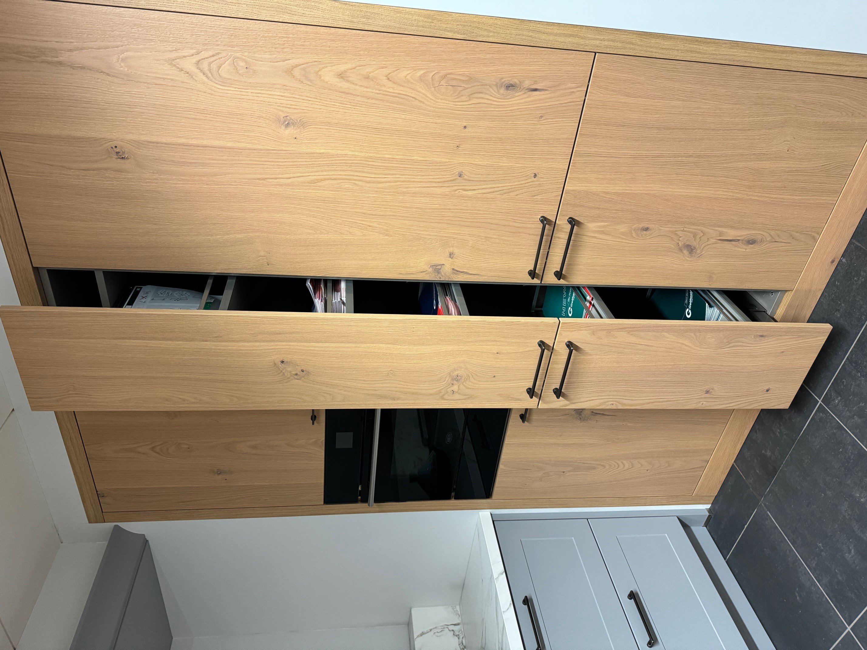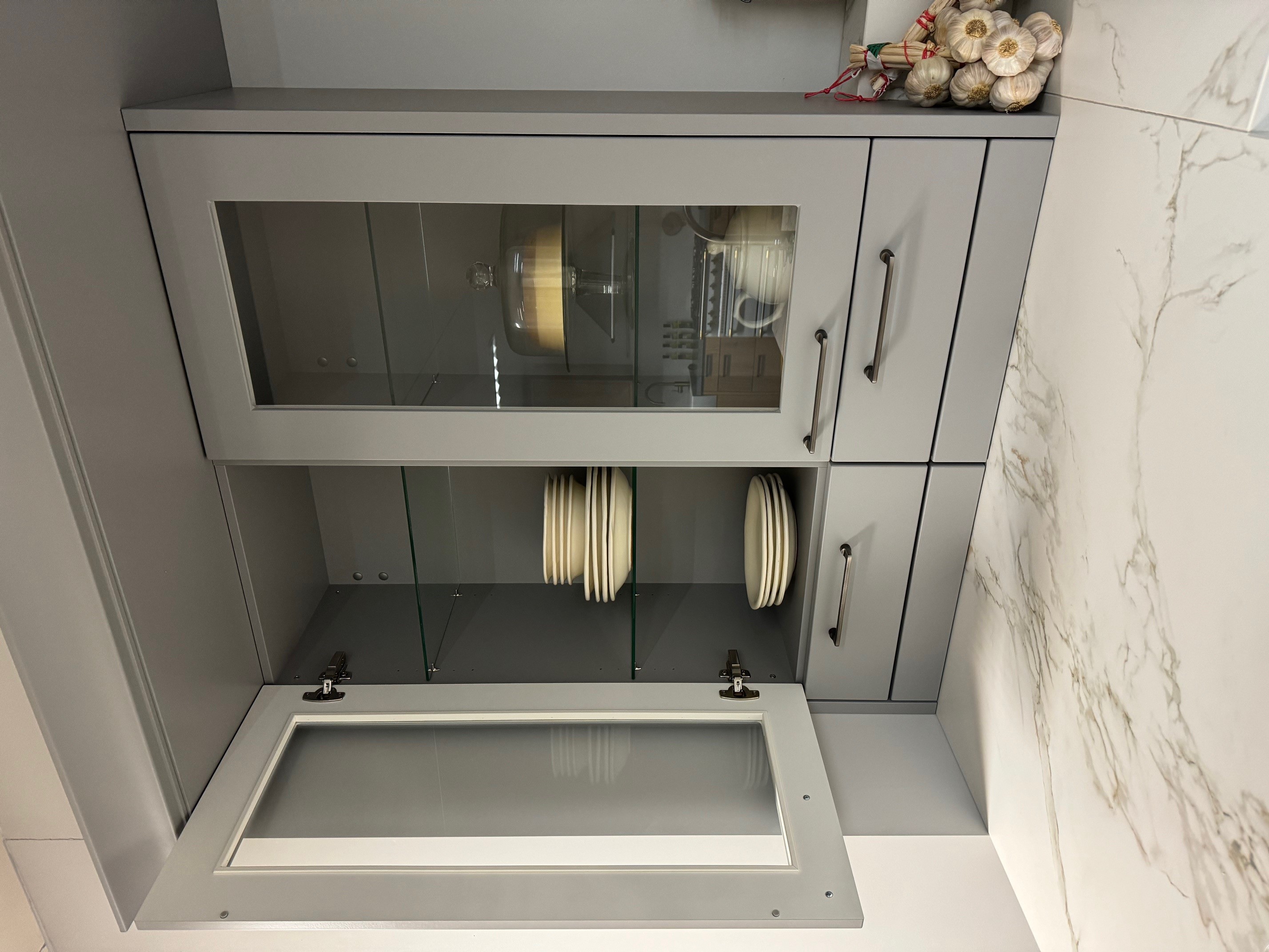 Uitvoering: Parelgrijs in combinatie met Wildeiken fineer geborsteld.